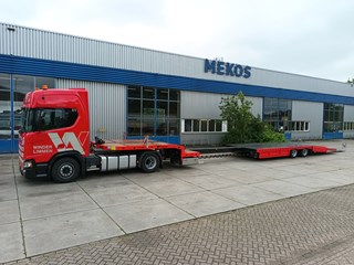 3 assige starre uitschuiftrailer omgebouwd naar 2 assige elektrisch gestuurd voor chalet vervoer, uitgevoerd voor klant Winder Limmen.